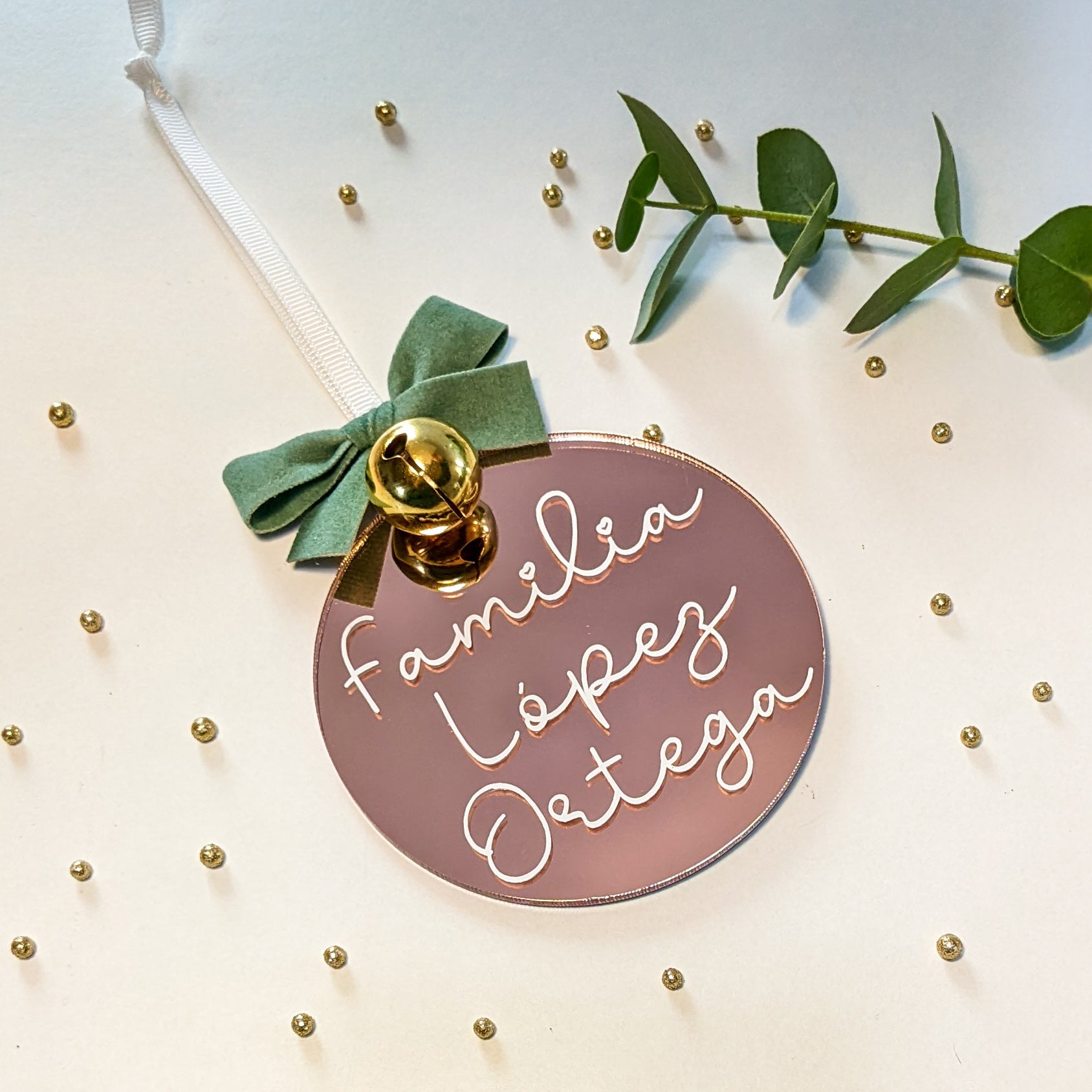 Bola plana de metacrilato efecto espejo con el nombre de tu familia personalizado.