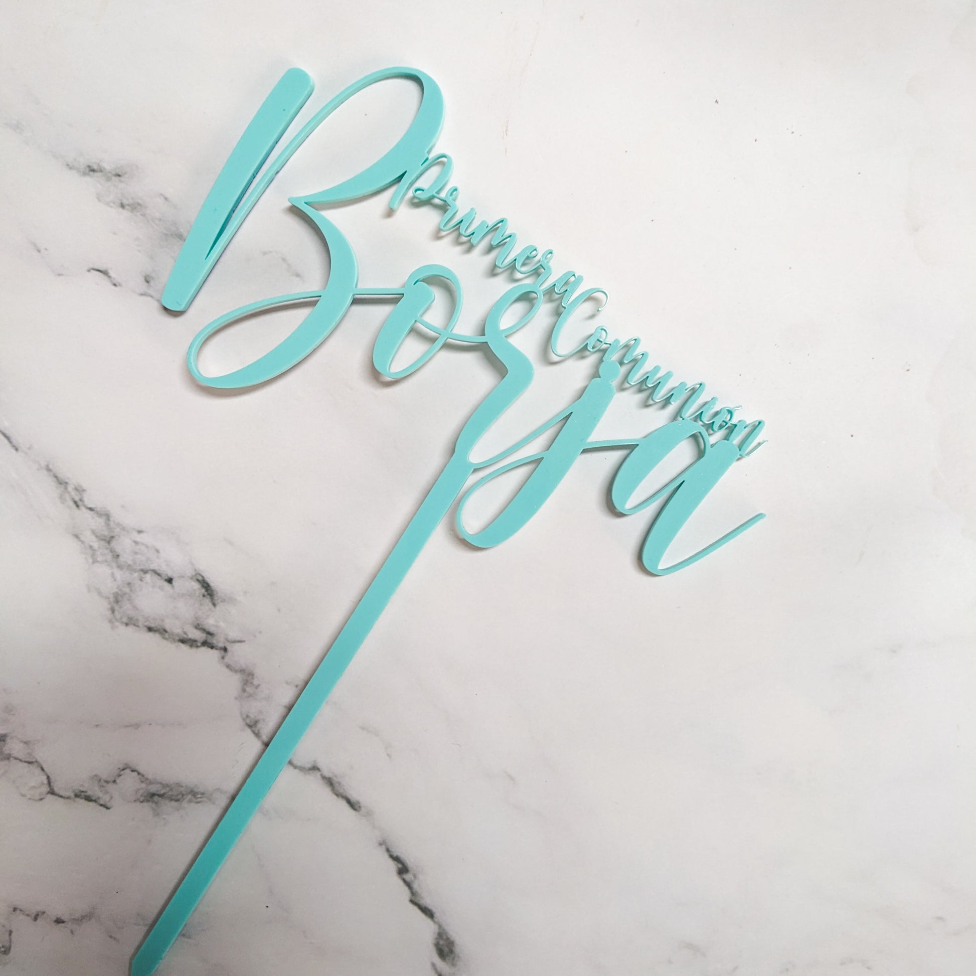 Corona tu fiesta de comunión con el topper Primera Comunión fabricado para tí en metacrilato, un detalle exclusivo y personalizado para la tarta de tu hijo. Los toppers son personalizados con el nombre del protagonista. La guinda perfecta para la tarta de un día tan especial.